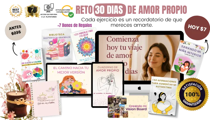 El valor real de este programa con todos sus bonos supera los $235 USD, porque incluye herramientas prácticas para sanar, elevar tu autoestima y aprender a amarte cada día más.