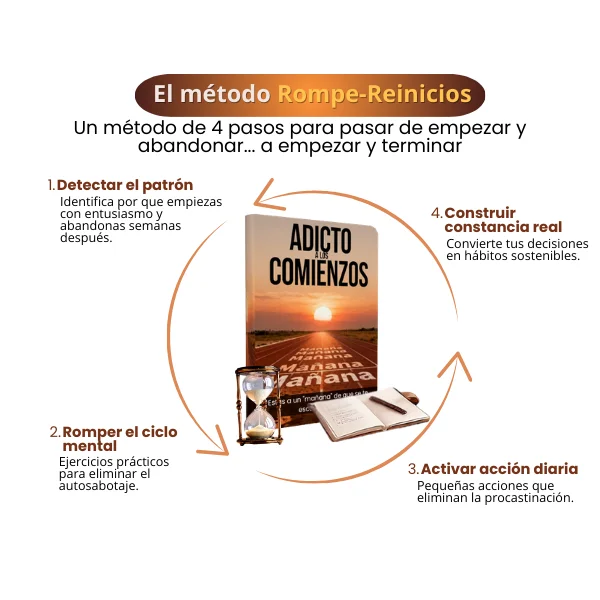 Un método práctico basado en cómo funciona el cerebro frente a la motivación y los hábitos, diseñado para romper el patrón que te hace empezar con entusiasmo… y abandonar semanas después.